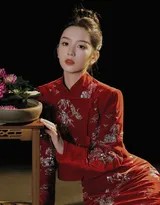 周也轻抚红色纱裙,姿态优雅如古典画卷,眼中闪烁着对新年的无限憧憬